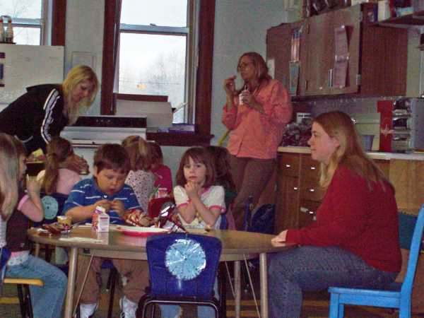 Head Start children enjoy a snack with aides (left to right) Denise
