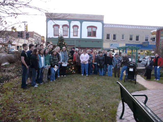 Downtown Pocket Park The city of Ironwood has started the Holiday Season with the annual Christmas Tree lighting ceremony at the downtown pocket park, and preparing for the Jack Frost Parade. People began gathering before 4 p.m., getting into the spirit with hot apple cider being served by city manager Scott Erickson. Mrs. Schroeder’s Accent Choir started of the festivities , entering singing Christmas songs and providing the setup for the introduction of the night’s guest speaker. Mayor Burchell welcomed Bill Johnson to the audience. Johnson entertained with poems and humor. The lighting of the Christmas tree was coordinated afterwards and a group gathering for photos around the lit tree and the Accent Choir performed additional songs for the evening. This year's Christmas tree was decorated by downtown businessmen Bill Penrose and RickTippett. The Jack Frost Festival continues with the Jack Frost Parade on Friday, December 4th. This year's parade theme is Jack Frost's Crystal Anniversary. The parade starts at at 6:00 p.m. beginning at the Carnegie Library on Aurora Street and continuing through downtown Ironwood |