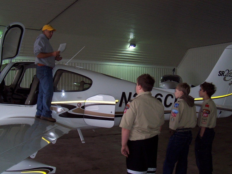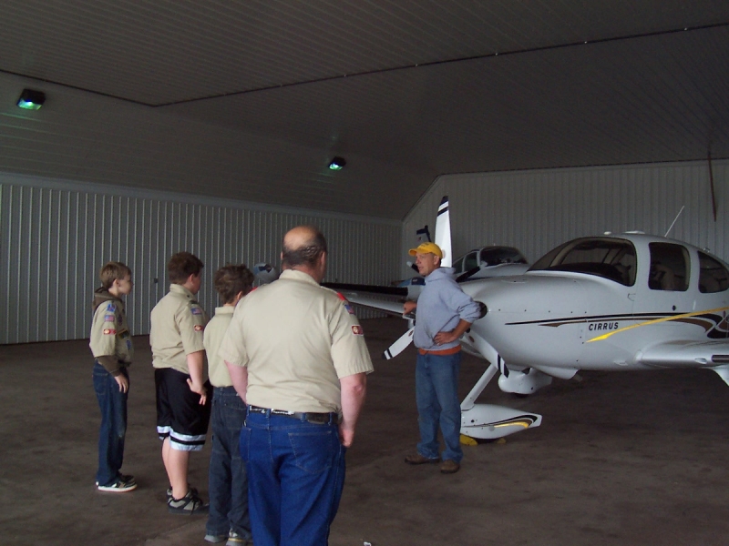 - Peter Palm (yellow cap) brings scouts to the hanger for