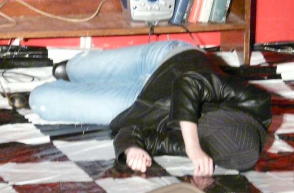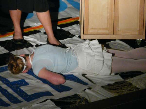 The cook (Kaarina Moreno) lying in the kitchen. |