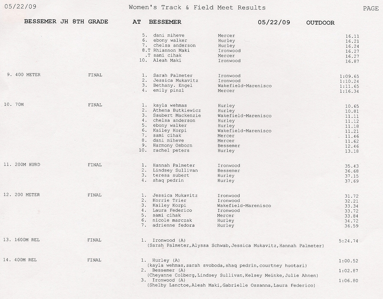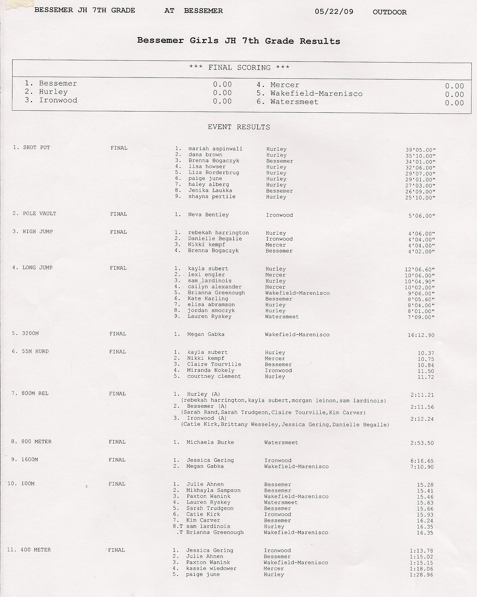 Results - Girls Events