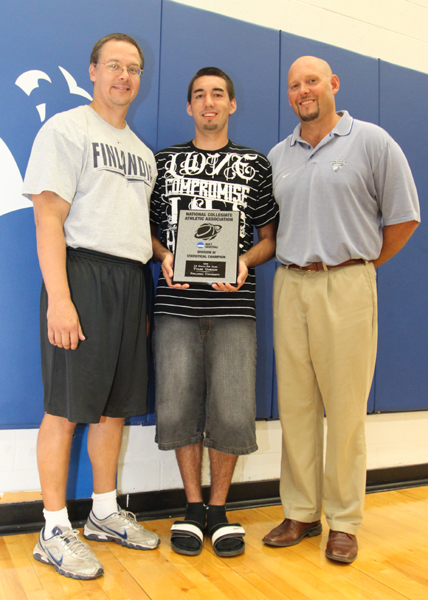 “Tyler has very good basketball instincts. He anticipates well, he has good court vision, and quick hands,” Kemppainen explained. “He plays both sides of the ball, his steals record proves his defensive skill, and on top of that he’s a top scorer on the offensive side. Kids like him don’t come along every day. Tyler will be hard to replace.” Armed with two top national statistical records and multiple team records, Gordon has hired an agent and hopes to begin his professional basketball career in Europe. This summer, he participated in a professional basketball combine on the East Coast and feels he did very well. For additional information about the Finlandia University men’s basketball program, please contact Coach Kemppainen at 906-487-7238 or charlie.kemppainen@finlandia.edu. Photo cutlines: Tyler Gordon with Award.jpg – Tyler Gordon captured the 2010 NCAA Division III statistical title for steals-per-game, finishing his final college career with a 3.60 average. Tyler Gordon with Coaches.jpg - Tyler Gordon (center), who captured the 2010 NCAA Division III statistical title for steals-per-game, with Finlandia University athletic director Chris Salani (left) and head men’s basketball coach Charlie Kemppainen.