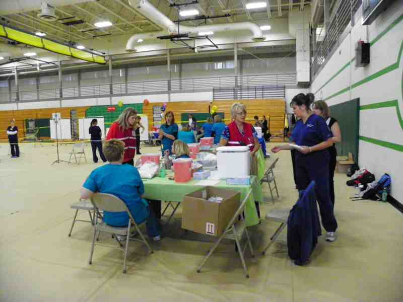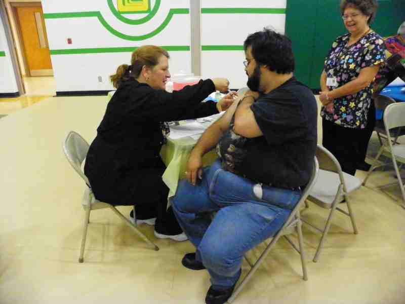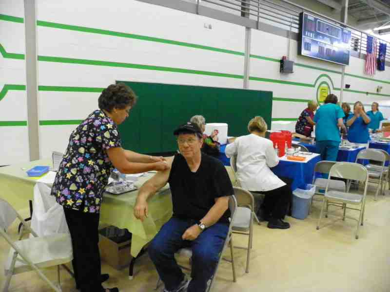 | above - volunteer Vic Calore waits for next victim-- oops --- that's next patient. Actually, you barely feel the shot at all. Truly a painless experience, right Vic? |
