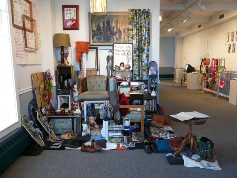 | Also featured in this exhibit and pictured above is an art installation by Siegler. Below is the Installation he entered in the 2009 Diploma Works exhibit. The items in the installation were items taken from his apartment and installed in the exhibit, It seems that Jordan has uncluttered his life quite a bit since graduation. |