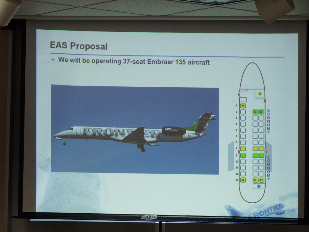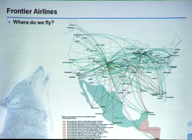 | Matt Barbieri representing Frontier Airlines, Inc followed DuRay in addressing the audiance. Barbieri also gave a power point presentation to the audience focusing on the capabilities of Frontier Airlines and its widespread operations. |