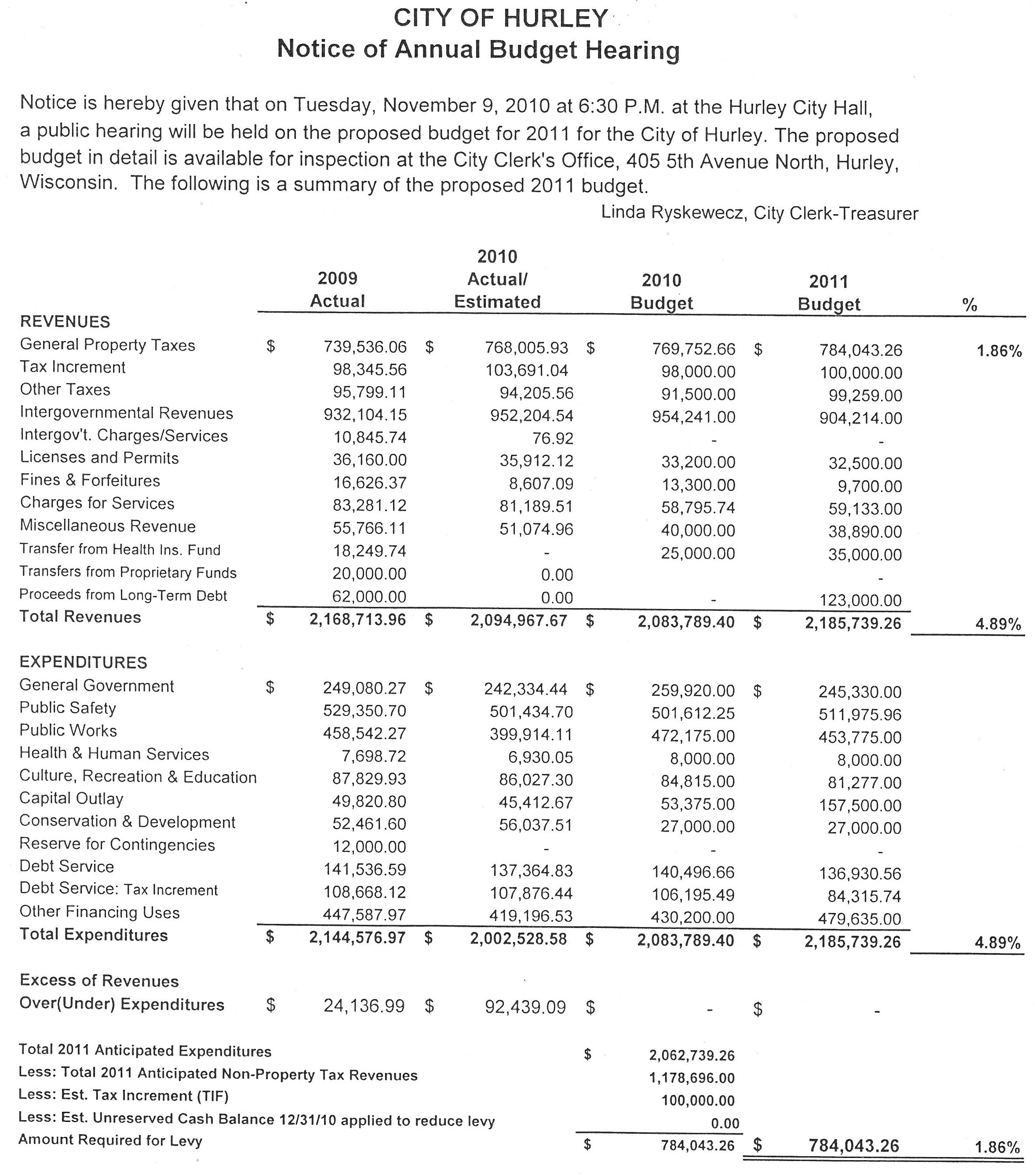 moved on to the regular meeting that followed. The 2011 Budget estimates the year end revenues for the budget period to be $2,185,739 . The 2010 Budgeted revenues were 2,083,789. An increase of 4.89% The 2011 general property tax revenues are budgeted to $784,043 an increase over the 2010 Budget amount of $769,753, an increase of $14,290 or 1.86% Budgeted Expenditures for 2011 are $2,185,739 an increase of $101,950 (4.89%) over the 2010 budget amount, $2,083,789. Expenditures increased for Public Safety by $10,364, however the expenditures for General Government decreased by $14,590 and the Public Works budget decreased by $18,400. The largest single change occurs in Capital Outlays expenditure. In 2010 the budgeted amount was $53,375 and the budget amount for 2011 is $157,500. an increase of $104,125. The Council unanimously approved the Budget Resolution No. 11-09-10 b |