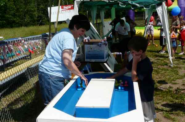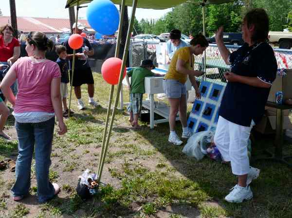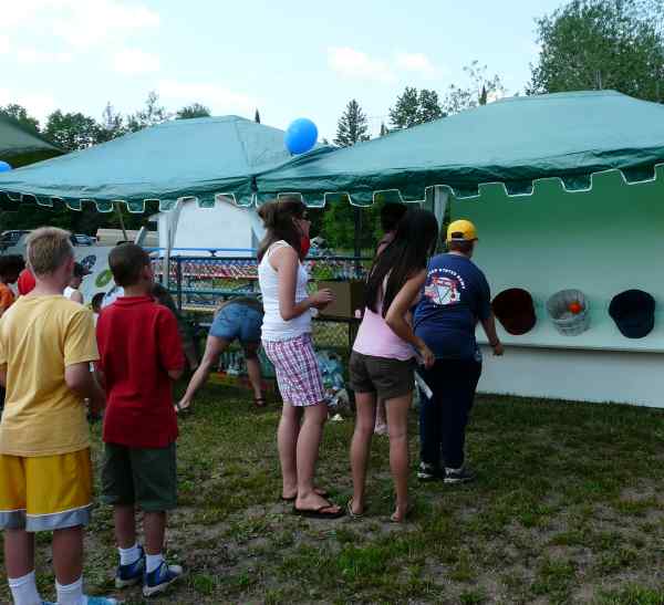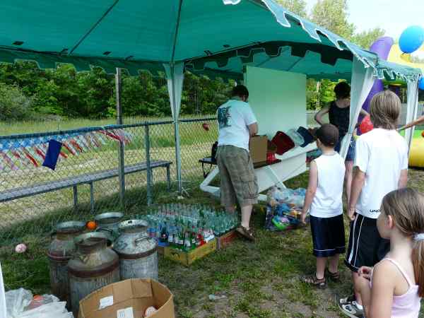 Tossing softball into milk cans and ring toss over pop