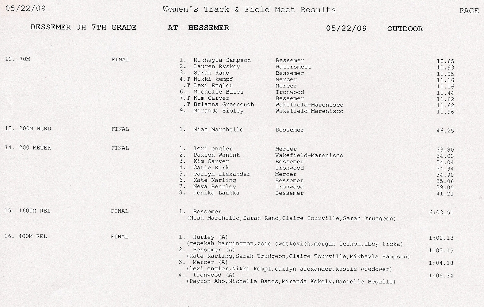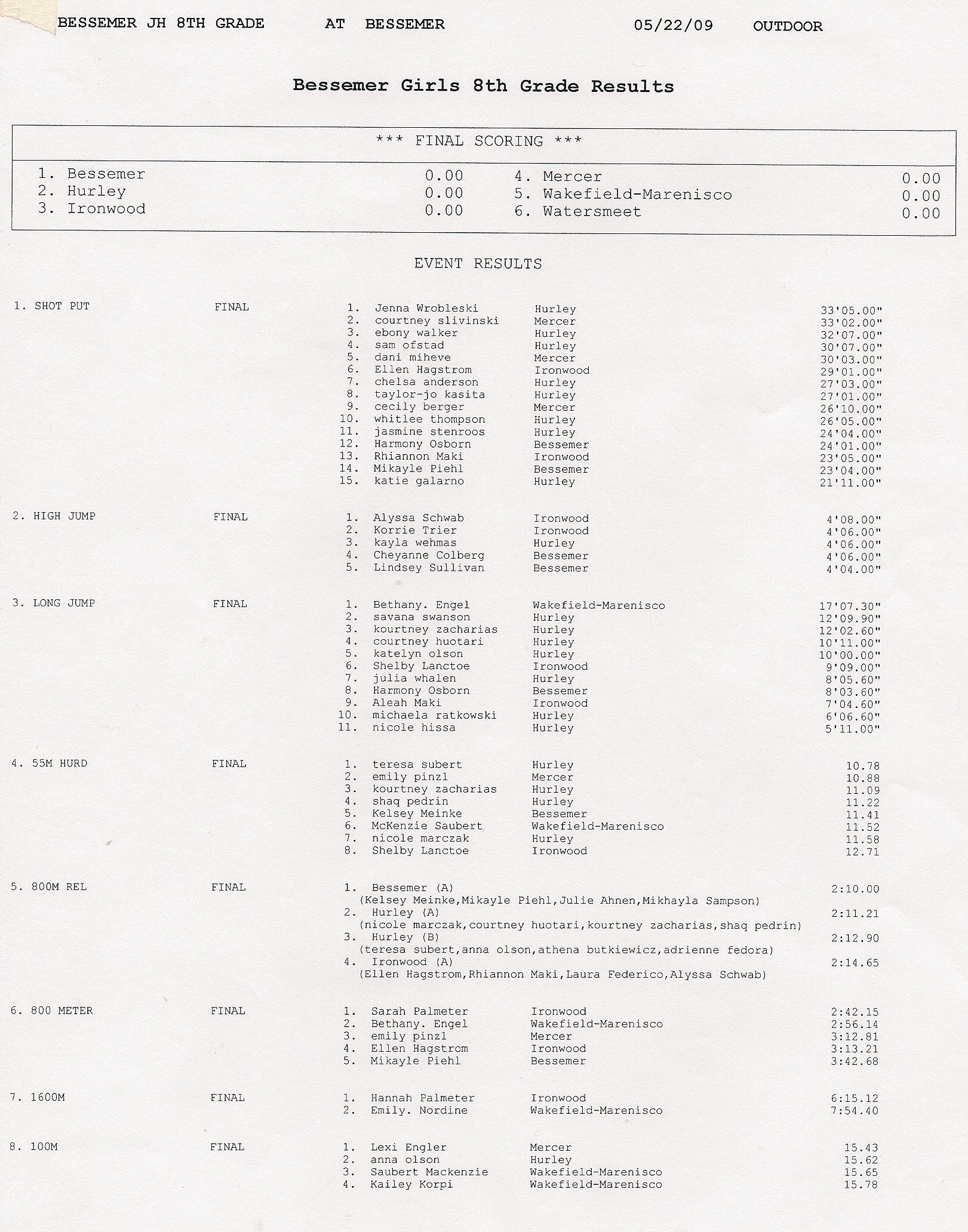 Results - Girls Events