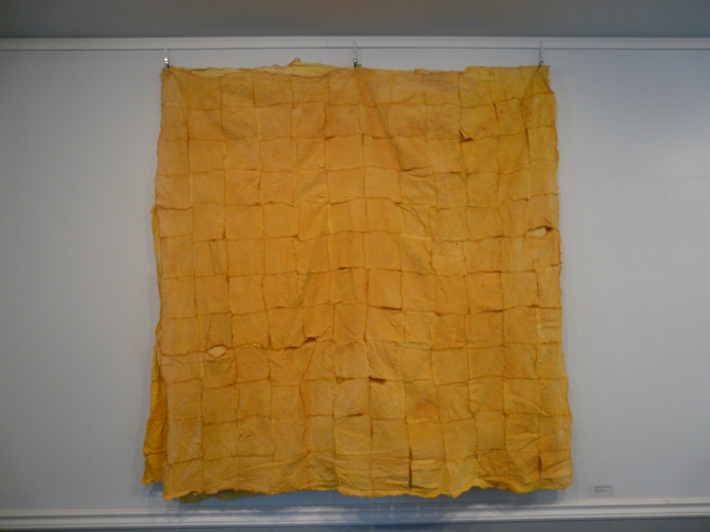 “Fugue (Grandmother’s Favorite),” featuring ink drawings on paper hand-made from 80-year-old sheet music; and “Aubade (Mnemosyne Sings),” comprising nine five-foot-square canvas panels dyed vibrant yellow using turmeric. |