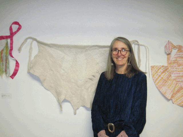 Finlandia associate professor Phyllis Fredendall, who teaches Fabric Art, stands in front of her apron design, exhibited at the show. | |